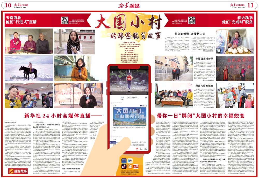 2020年12月31日0點(diǎn)0分0秒起,新華社26個(gè)國內(nèi)分社聯(lián)動(dòng),開啟24小時(shí)全媒體直播《大國小村的那些脫貧故事》。從白雪皚皚、零下40多攝氏度的黑龍江,到椰風(fēng)習(xí)習(xí)、零上10多攝氏度的海南,從海拔超4000米的高原,到廣袤的平原,從數(shù)十萬米之遙的衛(wèi)星視角,到纖毫畢現(xiàn)的特寫鏡頭……100余名新華社記者走進(jìn)散落于960萬平方公里土地上的小村,用鏡頭、用對話、用老鄉(xiāng)的皺紋與笑容,講述一個(gè)個(gè)鮮活的脫貧故事,繪就決戰(zhàn)脫貧攻堅(jiān)的恢宏畫卷。