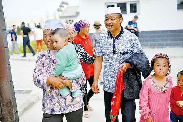 ▲馬幫林(右二)與老伴帶著孫子踏進(jìn)潤豐村新家(2017年8月17日攝)。