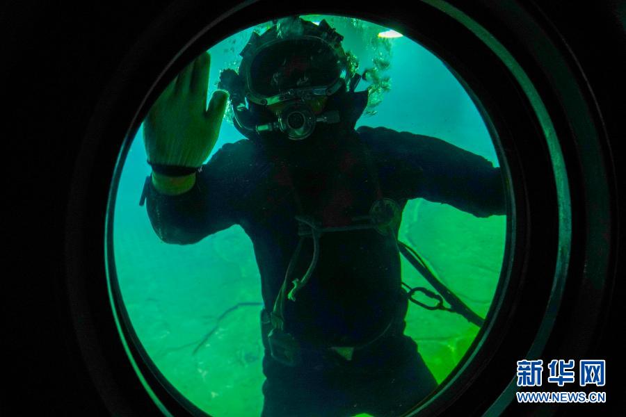 3月15日,在長江水下40多米的白鶴梁題刻無壓容器罩內,潛水員在對參觀廊道的觀察窗玻璃進行清理。新華社記者 劉潺 攝
