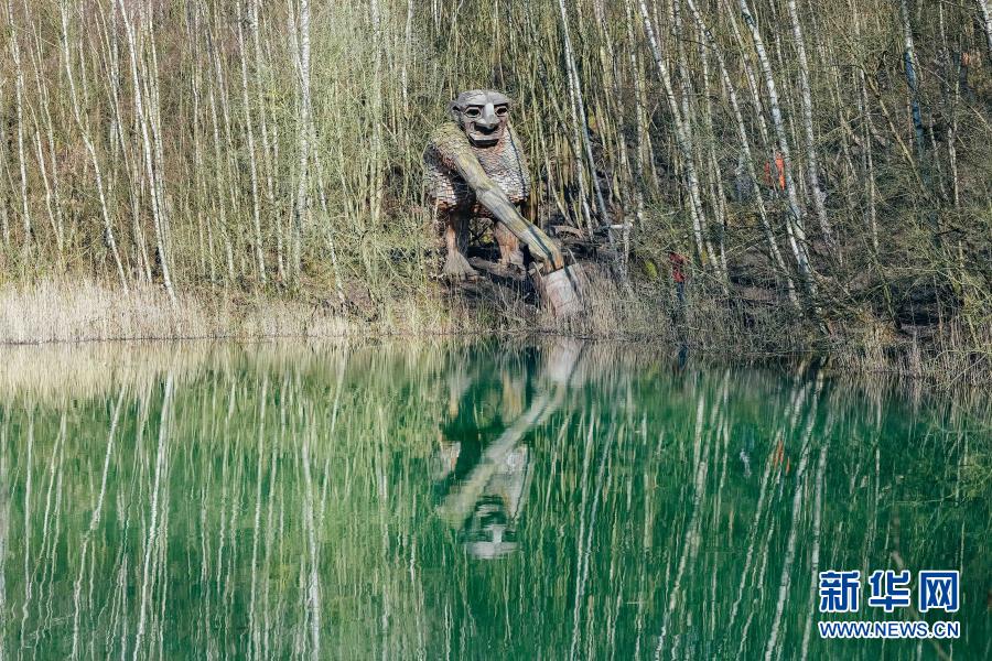 這是3月20日在比利時博姆市的德舒爾森林公園拍攝的一座“巨人”雕塑。新華社記者 張鋮 攝
