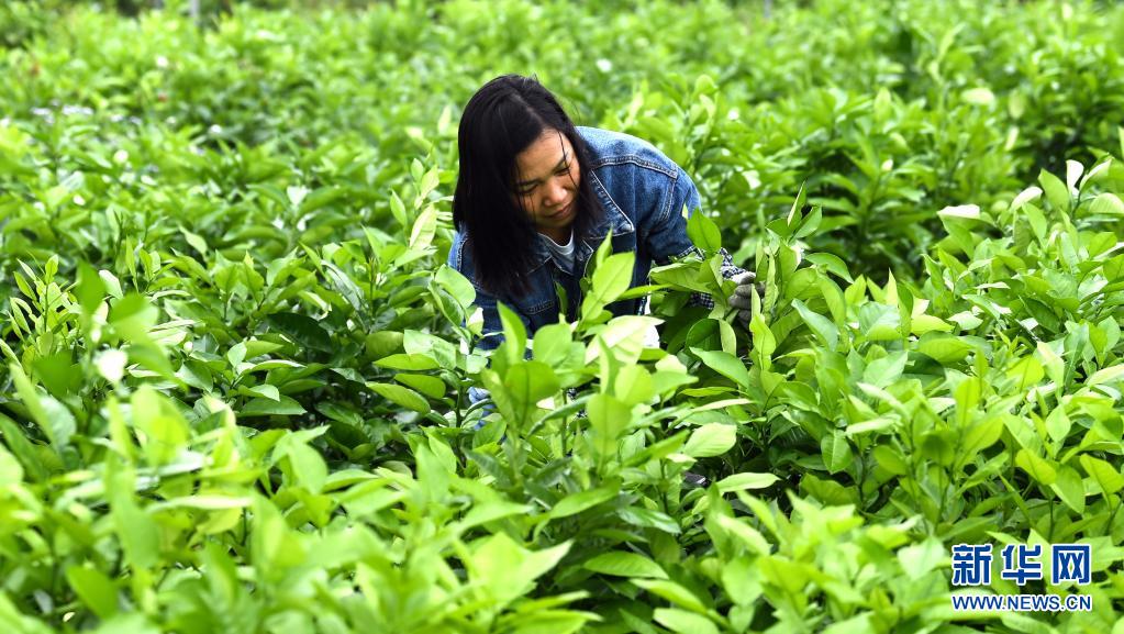 4月5日,廣西欽州市久隆鎮青草村村民在田間護理果苗。