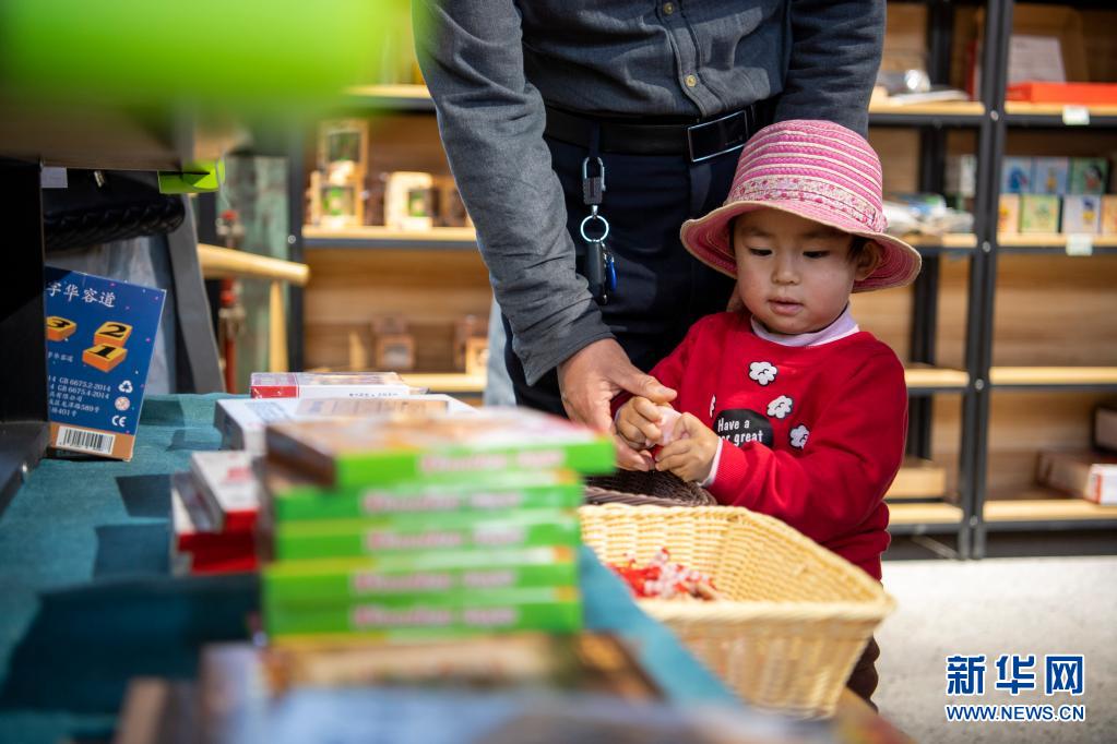 5月4日,小朋友在太原古縣城的一家店鋪內參觀游玩。