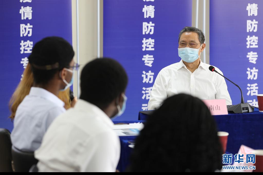 2020年4月15日,廣州市人民政府新聞辦公室在廣州醫科大學舉辦廣州市第78場疫情防控新聞采訪活動,鐘南山與在穗工作學習的外籍人士代表進行座談交流。新華社記者 李嘉樂 攝