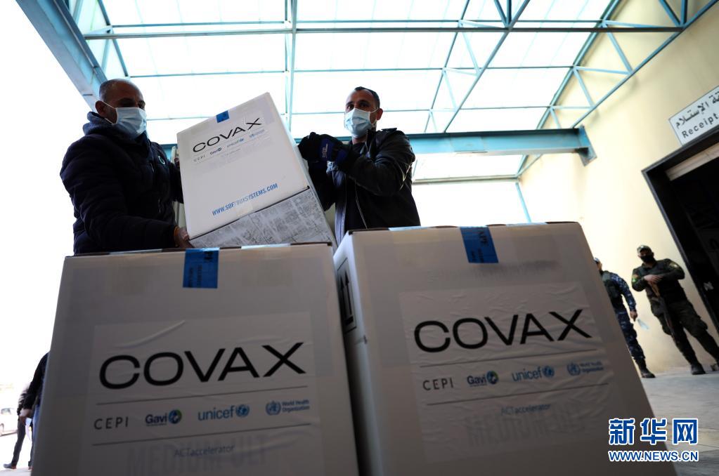 3月17日,在約旦河西岸城市納布盧斯附近的薩利姆鎮,巴勒斯坦工作人員搬運通過世界衛生組織主導的“新冠肺炎疫苗實施計劃(COVAX)”收到的新冠疫苗。新華社發(艾曼·諾巴尼攝)