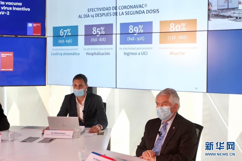 4月16日,智利衛生部長帕里斯(右)與智利衛生部顧問阿勞斯在圣地亞哥出席發布會,公布中國科興新冠疫苗保護效果在該國的真實世界研究結果。新華社發(智利衛生部供圖)