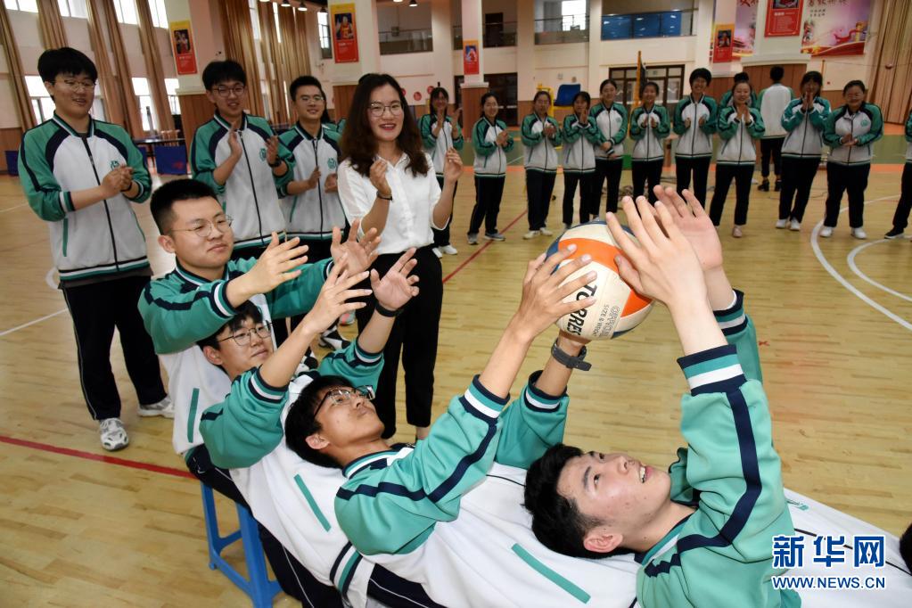 5月23日,青島通濟(jì)實(shí)驗(yàn)學(xué)校高三學(xué)生在進(jìn)行“躺椅傳球”游戲。