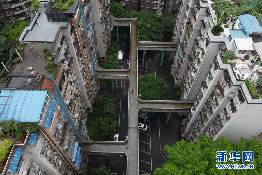 繼輕軌穿樓、高鐵穿樓、“貓頭鷹”立交橋之后,重慶又一建筑走紅網絡。近日,有網友發現,重慶渝中區一個老小區幾棟居民樓的4樓中間,建起了連接各個單元的空中走廊,居民出入猶如空中漫步。新華網 耿駿宇 攝