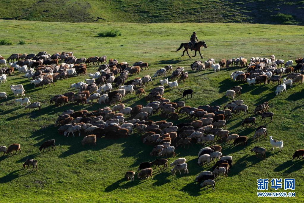 新疆裕民縣的牧民在巴爾魯克山區夏牧場上放牧(6月14日攝)。