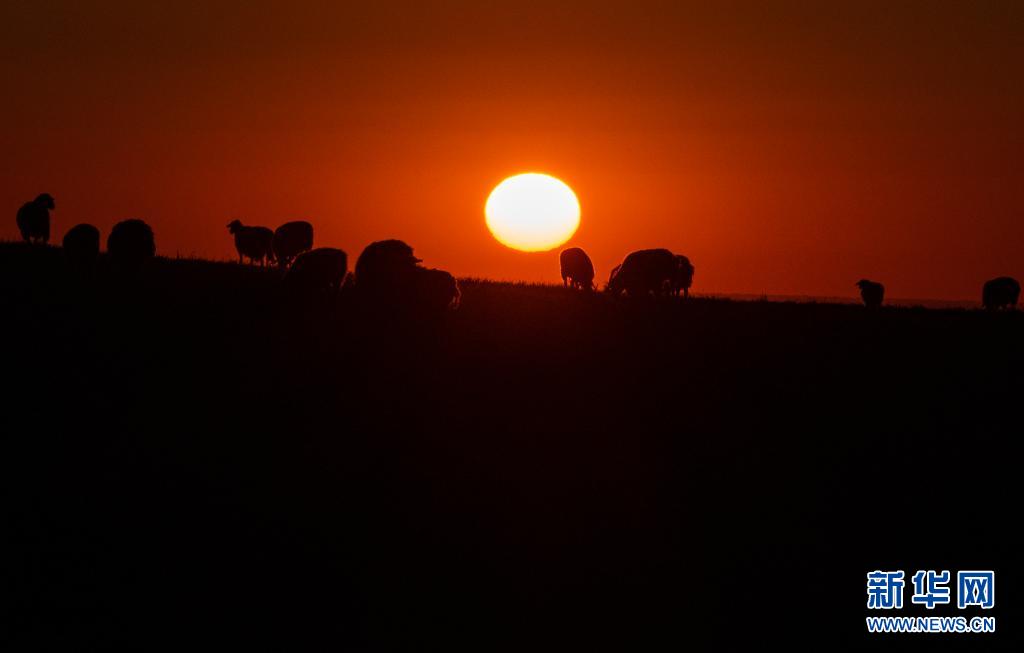 落日映紅新疆裕民縣巴爾魯克山區夏牧場的天空,羊群仍流連于牧草,緩緩而歸(6月15日攝)。