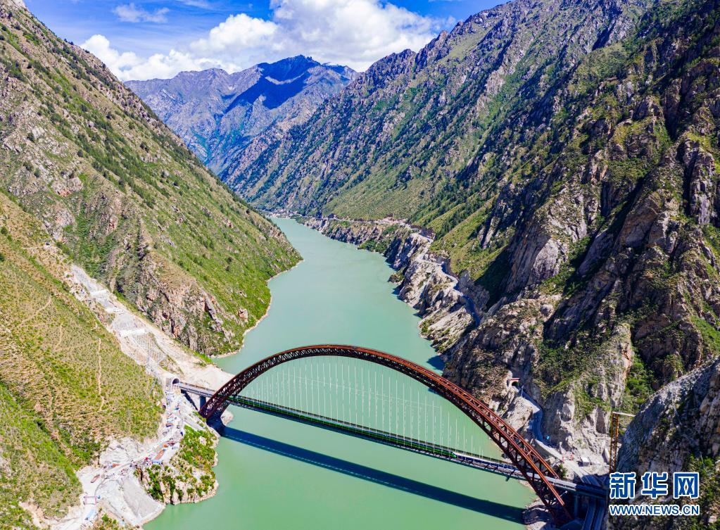 試運行的復興號列車行駛在藏木特大橋(6月17日攝,無人機照片)。