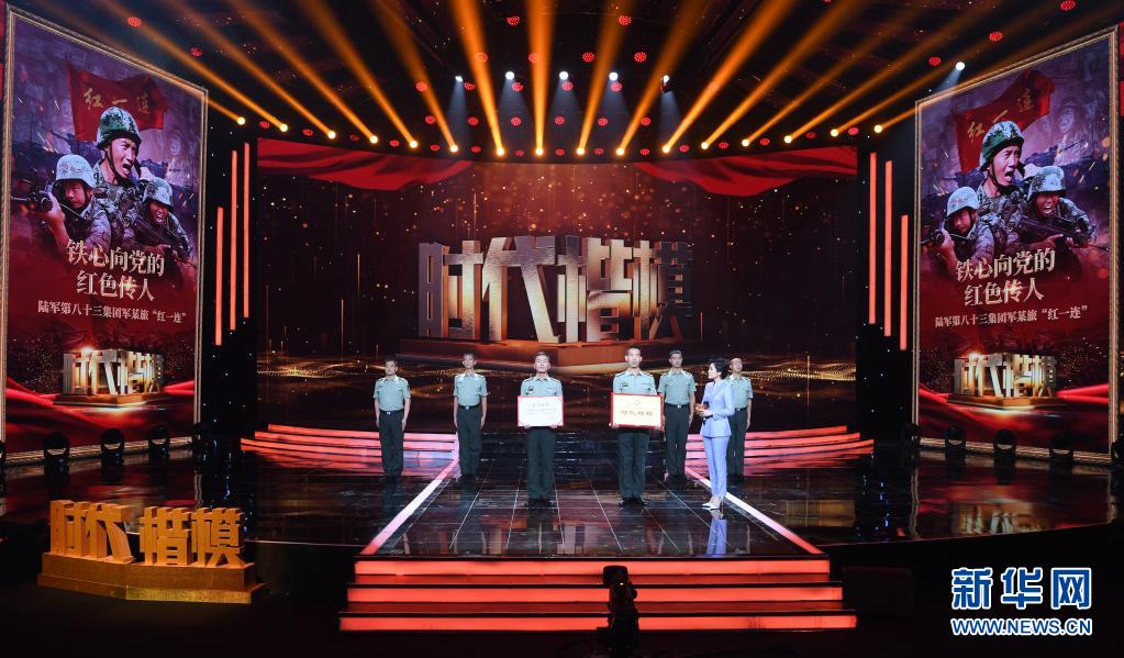 在“時代楷?!卑l布儀式上,陸軍第八十三集團軍某旅“紅一連”官兵代表領取“時代楷模”獎牌和證書(7月23日攝)。新華社記者 張永進 攝