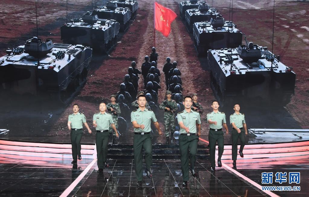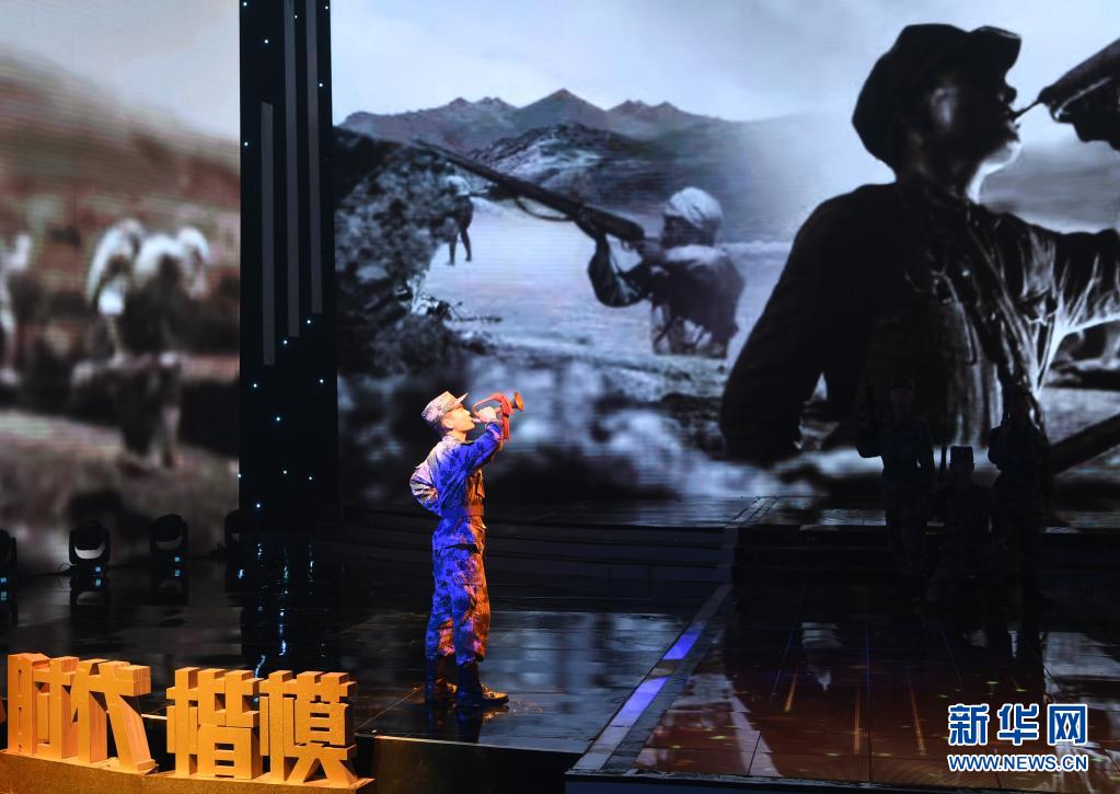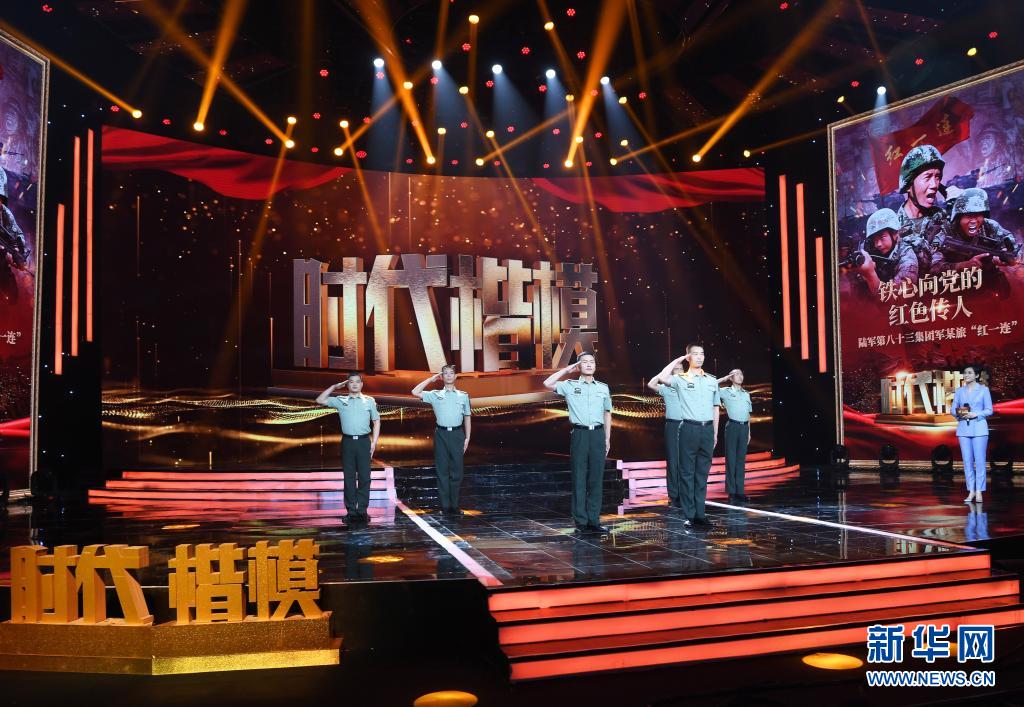 在“時代楷模”發布儀式上,陸軍第八十三集團軍某旅“紅一連”官兵代表表演節目《紅色堡壘》(7月23日攝)。新華社記者 張永進 攝