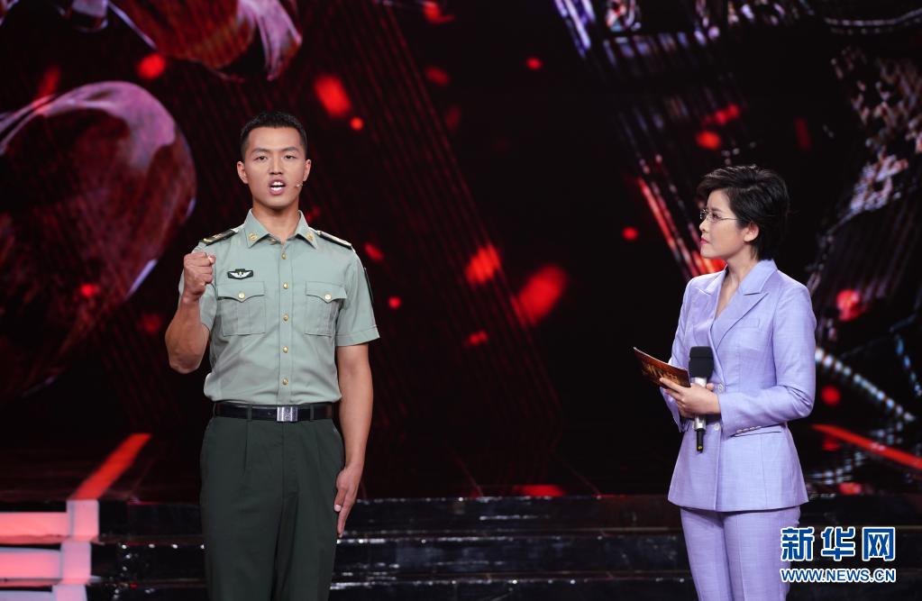 在“時代楷模”發布儀式上,陸軍第八十三集團軍某旅“紅一連”副班長徐謙(左)講述黨員骨干“跟我來”的故事(7月23日攝)。新華社記者 張永進 攝