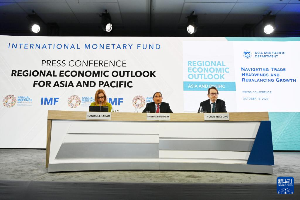 10月16日,在美国华盛顿,国际货币基金组织(IMF)亚太部主任斯里尼瓦桑(中)在新闻发布会上讲话。新华社记者 李睿 摄