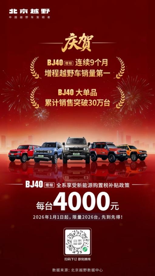 2026年1月1日,北京越野行业首发 “国补延续 BJ加码” 专项活动,以“国补+厂补”双重让利惠及用户,购BJ40增程全系车型至高享国补15000元,厂补4000元,全国限量2026台。