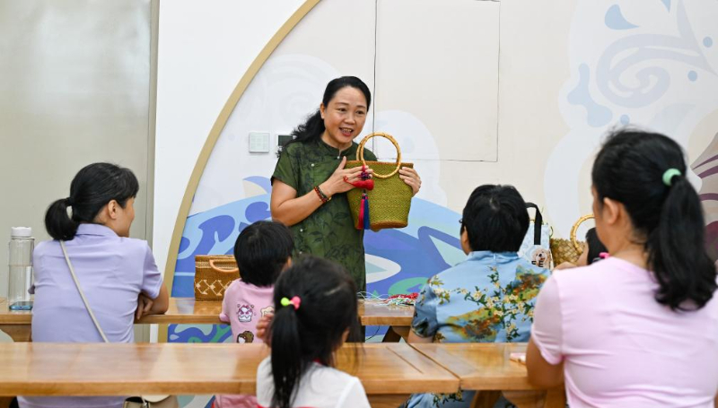 10月12日,在海南省文化馆,东山草编技艺传承人袁洁(后中)为家长和小朋友们讲解东山草编技艺。