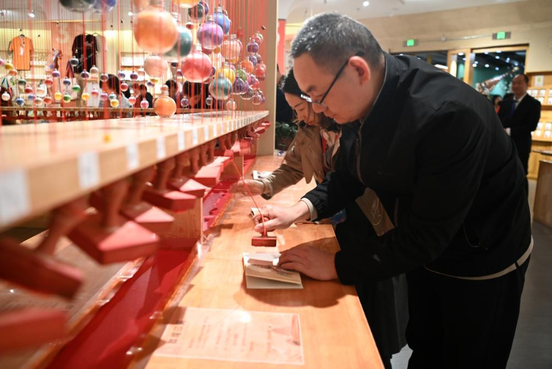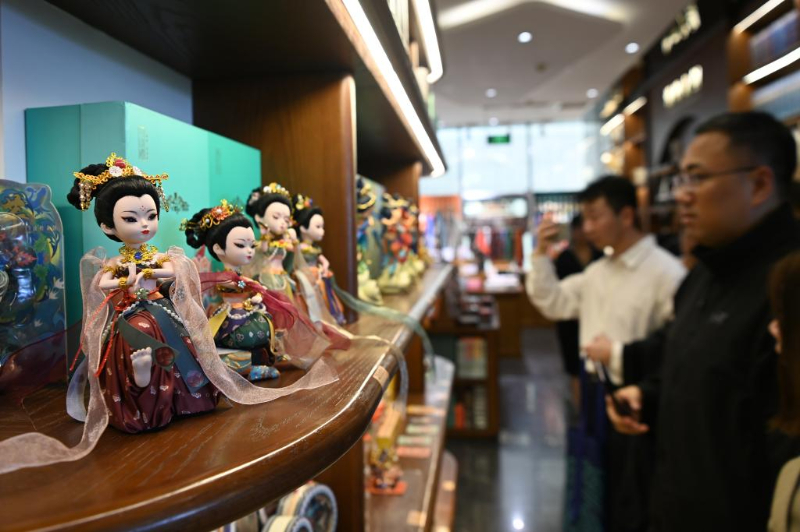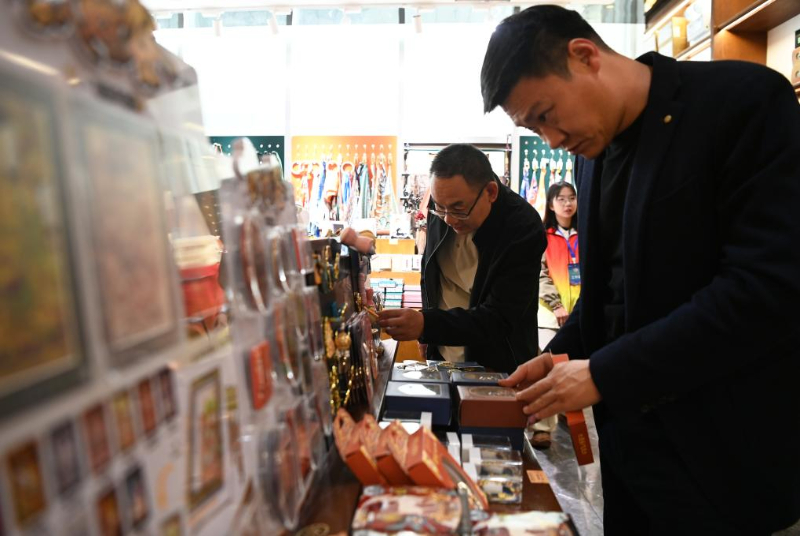 10月11日,游客在敦煌书局选购文创产品。
