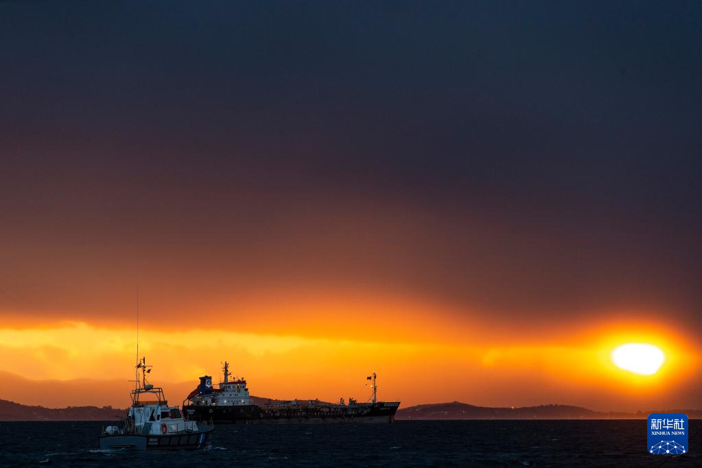 这是2月4日在希腊雅典西部的埃莱夫西斯拍摄的落日景象。