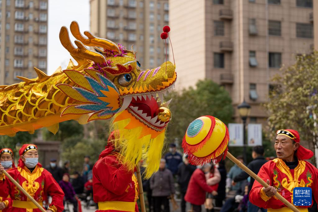 2月21日,在安徽省合肥市肥东县合肥循环经济示范园泰和社区,人们在表演舞龙。