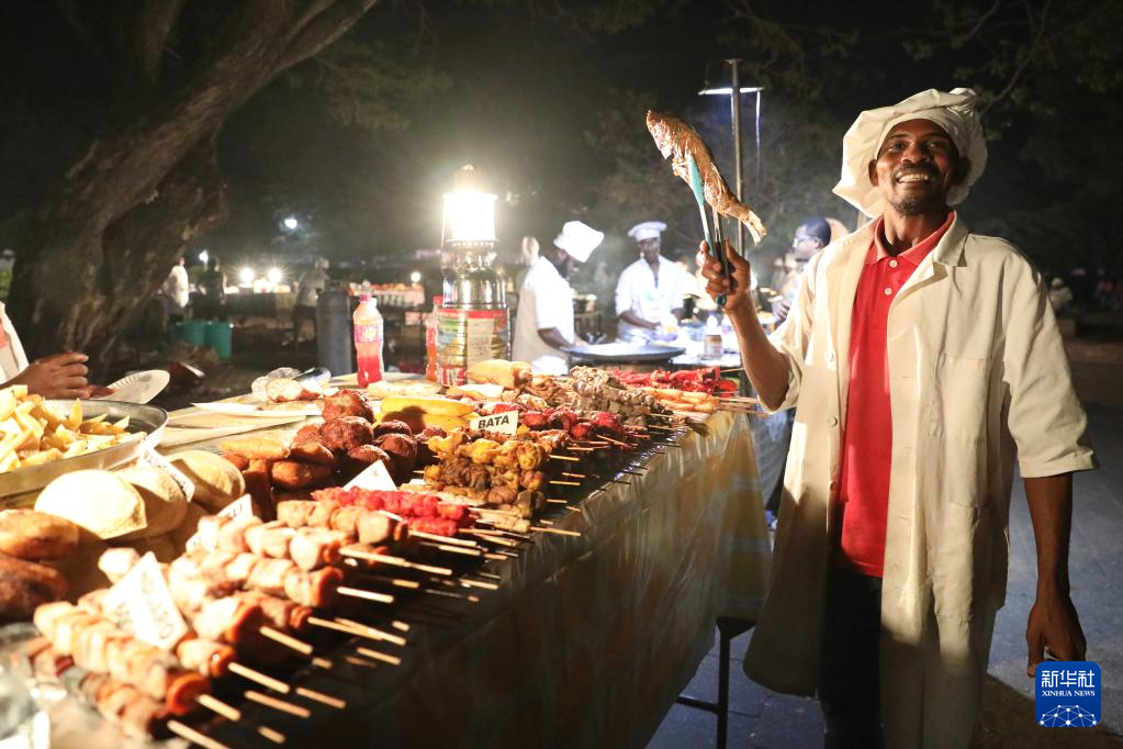 2月21日,在桑给巴尔石头城夜市,一名摊主展示烤鱼。