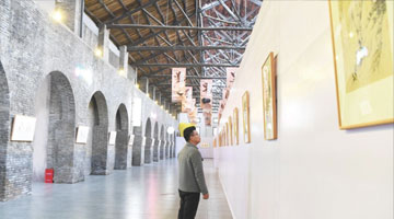 3月21日,参观者在遂平县1955工业文化创意园的老厂房内参观画展。