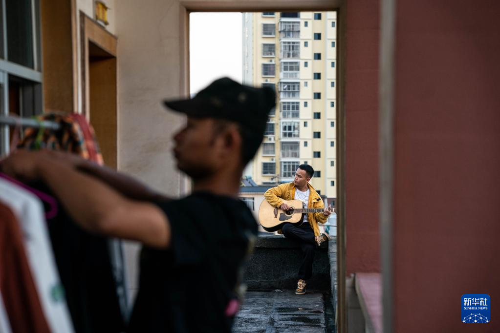 耿马县民族歌舞团演员能底(右)在宿舍楼露台弹吉他(3月23日摄)。