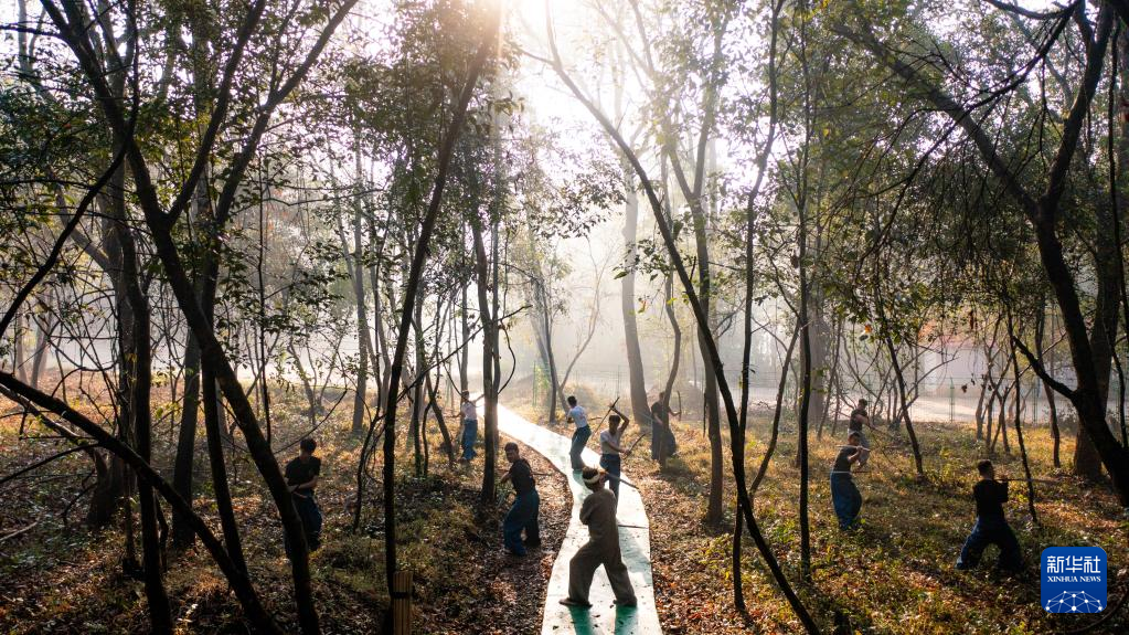 耿马县民族歌舞团的演员们在练习刀舞(无人机照片,3月23日摄)。