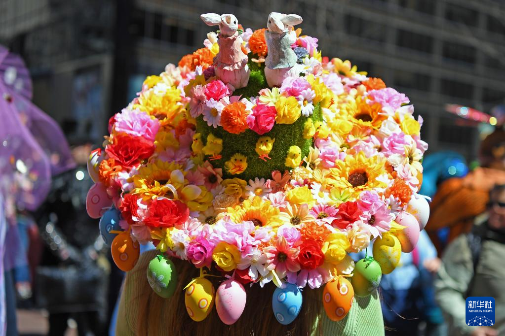 当日是西方传统节日复活节,人们头戴精心制作的花帽,在纽约第五大道参加一年一度的复活节游行。
