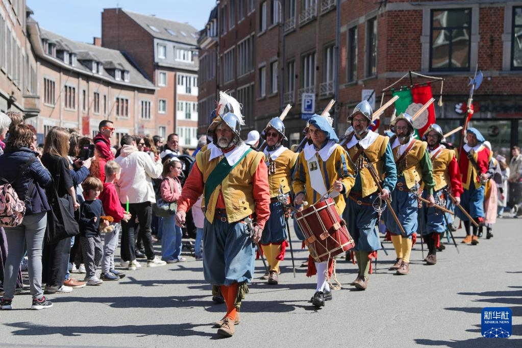 4月15日,身着古装的演员在比利时那慕尔市传统民俗日活动上表演。