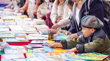 4月22日,一名小朋友在吉林省图书馆前的“换书大集”挑选图书。