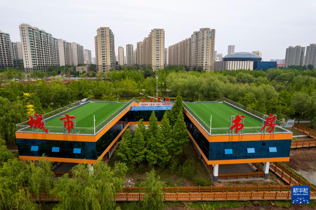 4月24日在山东省临沂市临沭县拍摄的城市书房(无人机照片)。