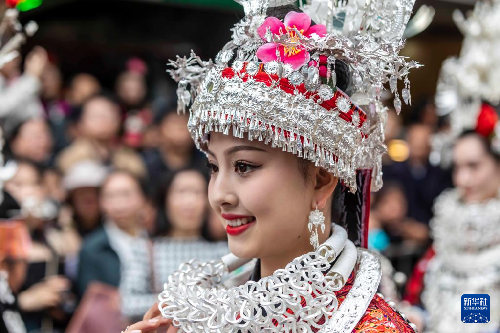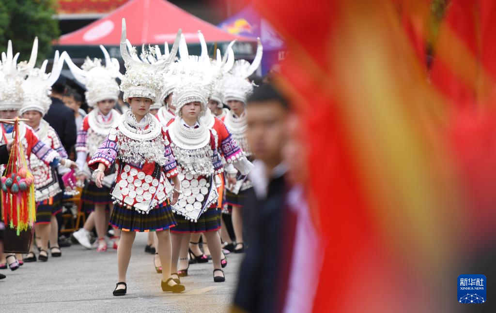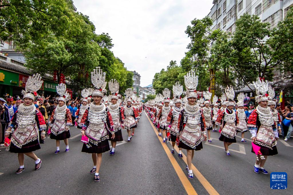 5月2日,人们在贵州省台江县参加苗族姊妹节盛装巡游。