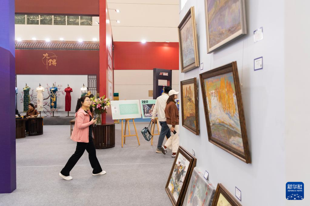 5月7日,在哈尔滨国际会展体育中心,观众在首届东北亚文化艺术创意设计博览会上参观。