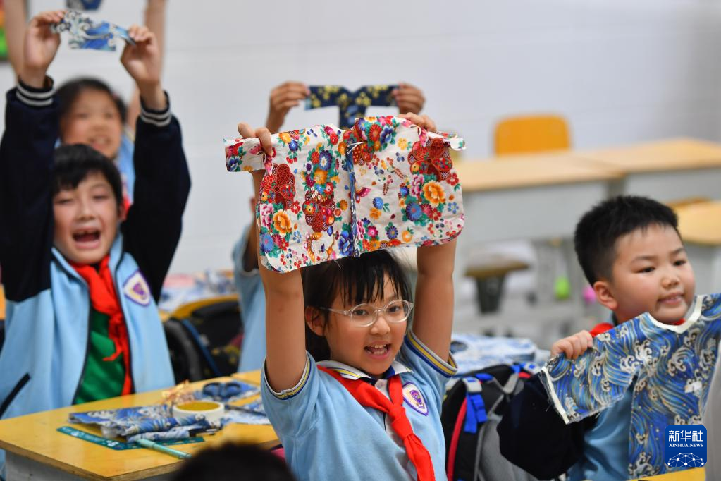 5月15日,在长沙市天心区红卫小学,学生在传统服饰设计课上展示作品。