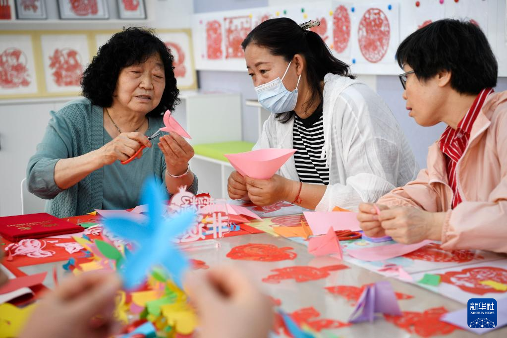 5月17日,老师(右二)向居民传授剪纸技艺。