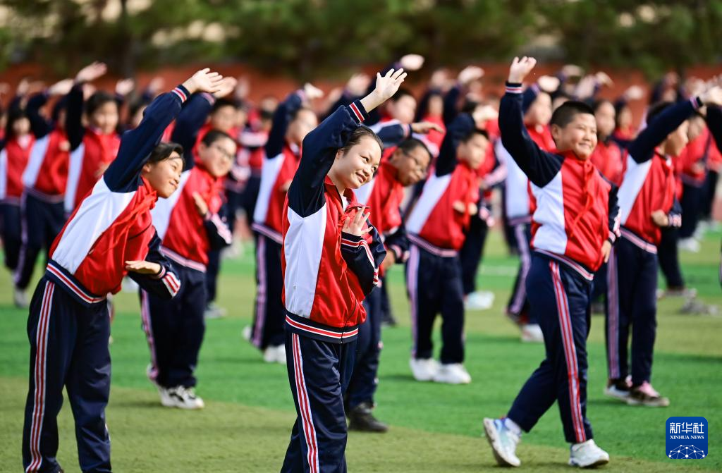 5月17日,乌兰浩特市山城路小学学生在“戏曲传承进校园 梨园雅韵润童心”主题活动中展示课间戏曲操。