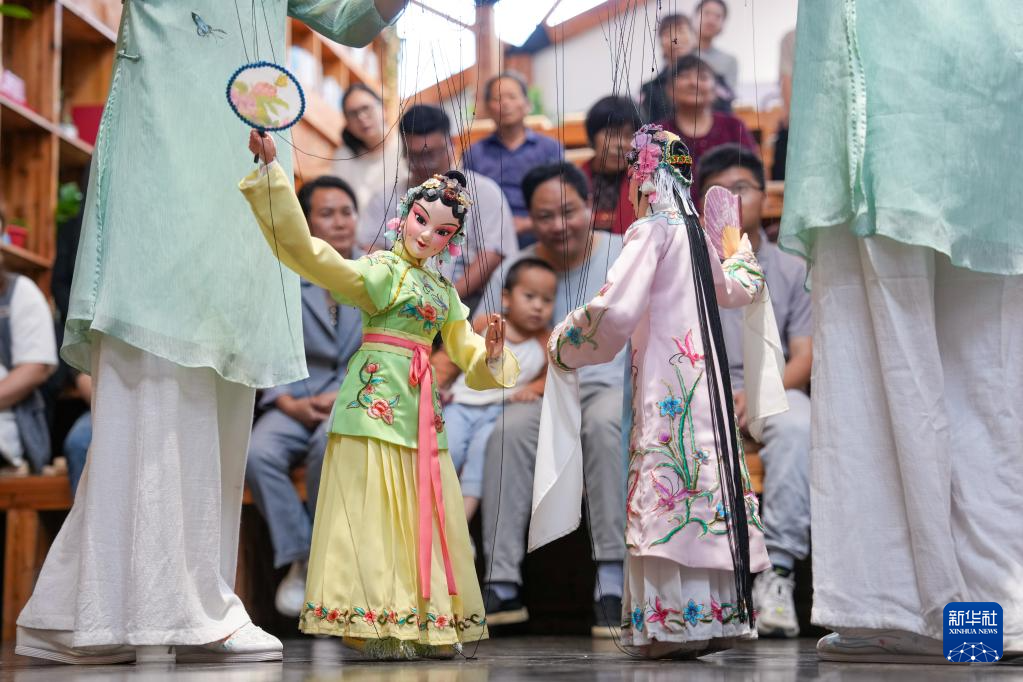 5月17日,孙菁(左)、施锦芳在七都镇江村文化礼堂表演昆曲木偶《牡丹亭·游园》。