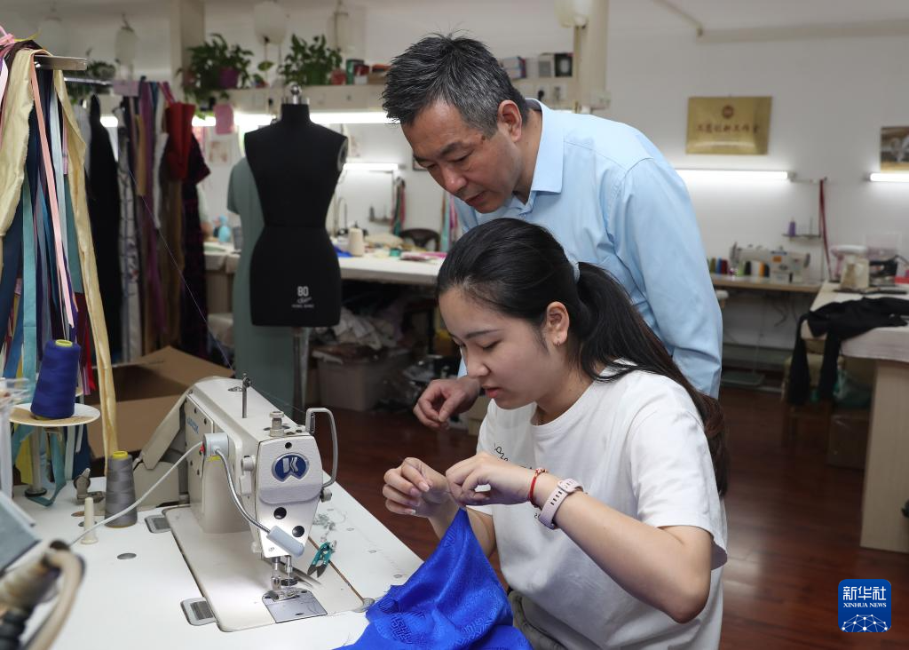 5月31日,江满宗(后)在上海市“龙凤旗袍制作技艺——国家级非物质文化遗产传习所”为徒弟吴雨婷传授技艺。