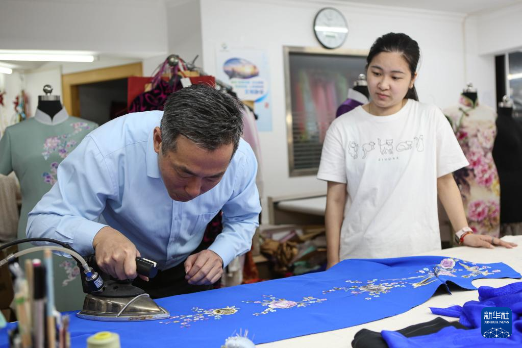 5月31日,江满宗(左)在上海市“龙凤旗袍制作技艺——国家级非物质文化遗产传习所”整烫绣花片。