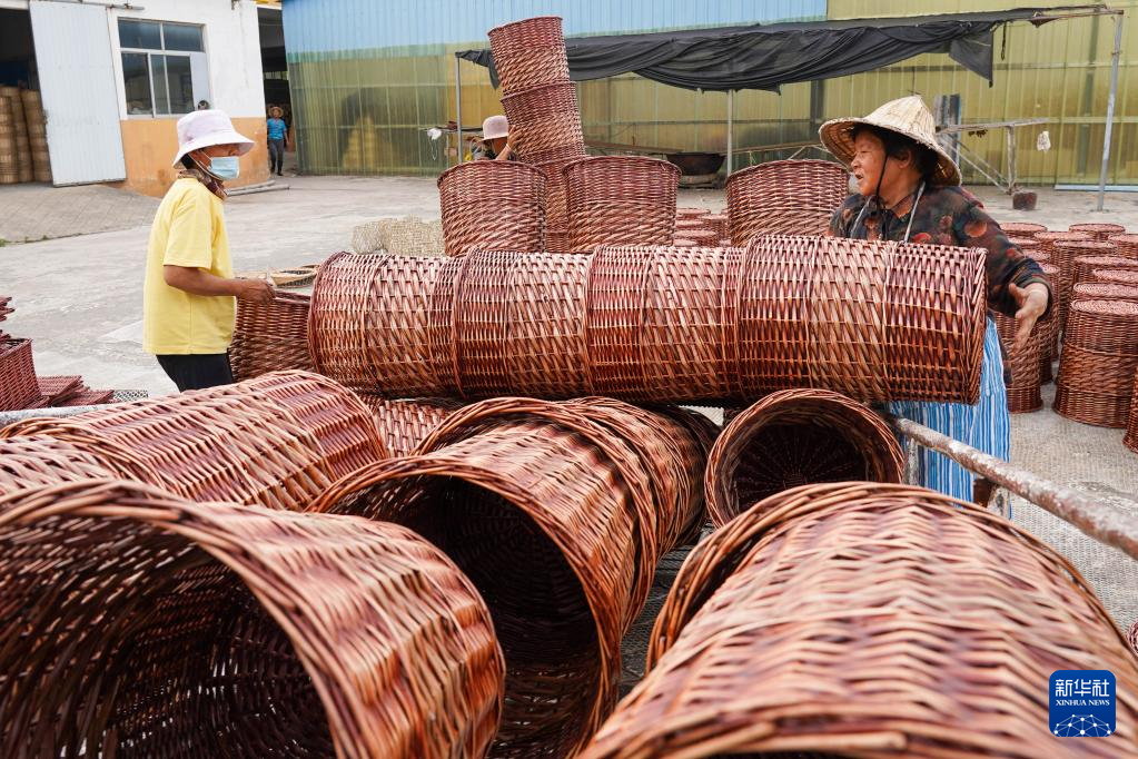 6月6日,临沂金柳工艺品有限公司员工在晾晒柳编产品。