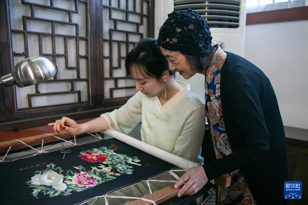 在重庆市渝中区的重庆渝康宁蜀绣艺术研究院,康宁(右)在指导学生(5月14日摄)。