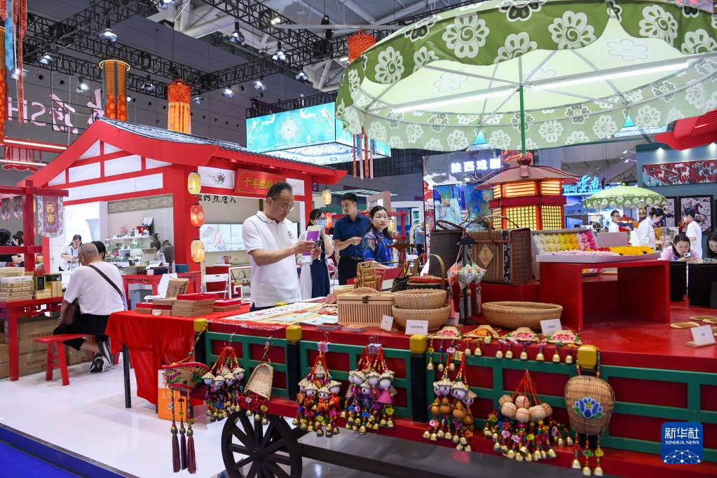 6月9日,在文博会“文旅消费馆·一带一路国际馆”陕西展台,观众浏览选购特色商品。