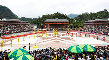 6月27日,当地干部在介绍神臂城内的蛇盘龟玄武石刻。石龟周长20米,背高1.88米,龟背上缠着一条长21.5米的大蟒蛇,用天然整石雕凿而成。