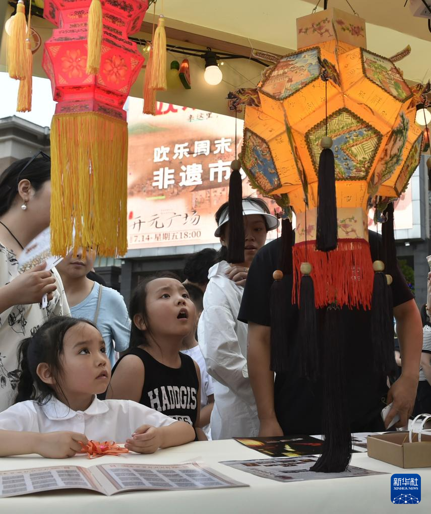 7月14日傍晚,小朋友在开封市开元广场设立的“非遗市集”现场观看传统彩灯制作。