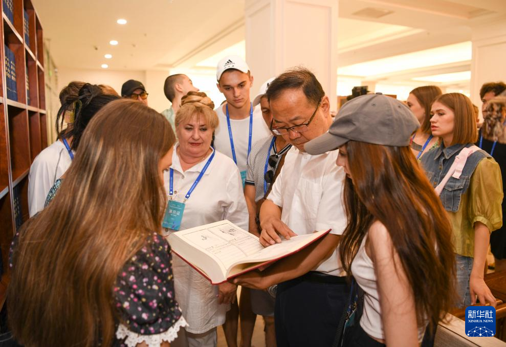 新疆古籍修复师米娜瓦尔·阿不都热合曼(左一)向俄罗斯萨拉托夫州曙光歌舞团演员赠送桑皮纸(7月23日摄)。