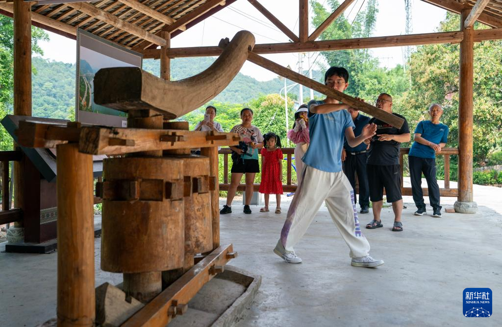 7月30日,一名游客在坡芽村内体验壮族传统的甘蔗榨汁机。