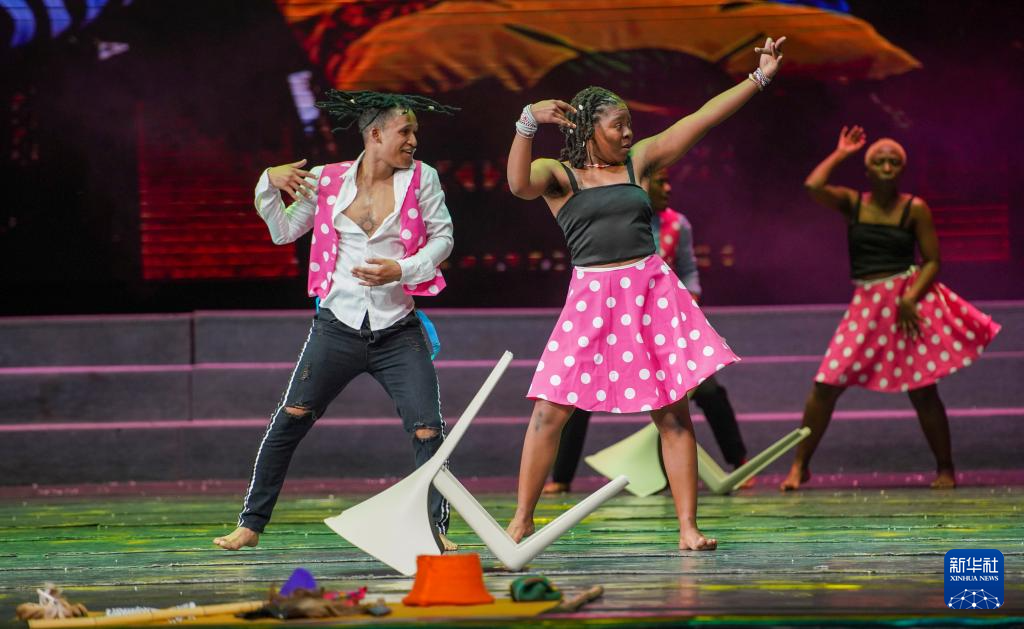 南非埃尔维斯舞蹈艺术团的演员表演舞剧《乌班图之魂》(7月25日摄)。新华社记者 张啸诚 摄