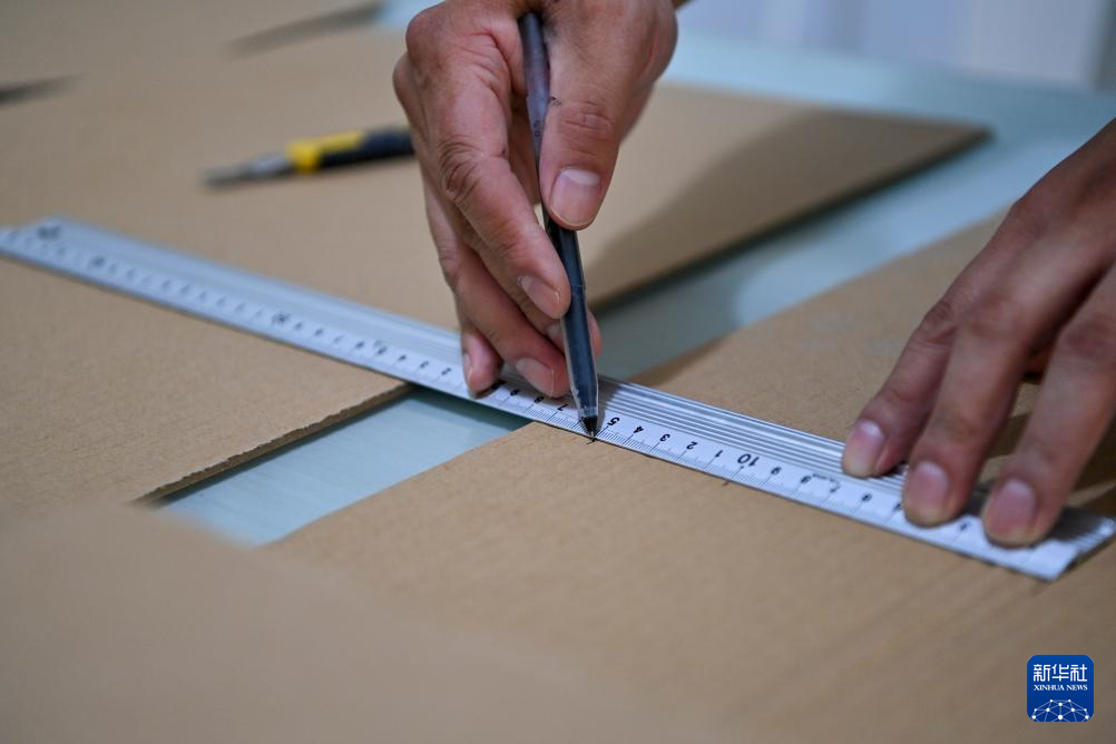 王帅栋在位于山西省太原市万柏林区的工作室内测量瓦楞纸尺寸(8月1日摄)。
