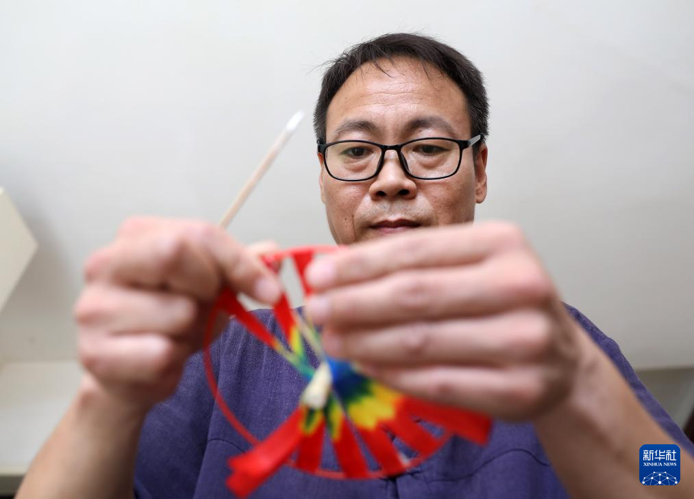 8月17日,崔凯在辽宁省营口市自己家中制作吉祥轮彩纸风车骨架。
