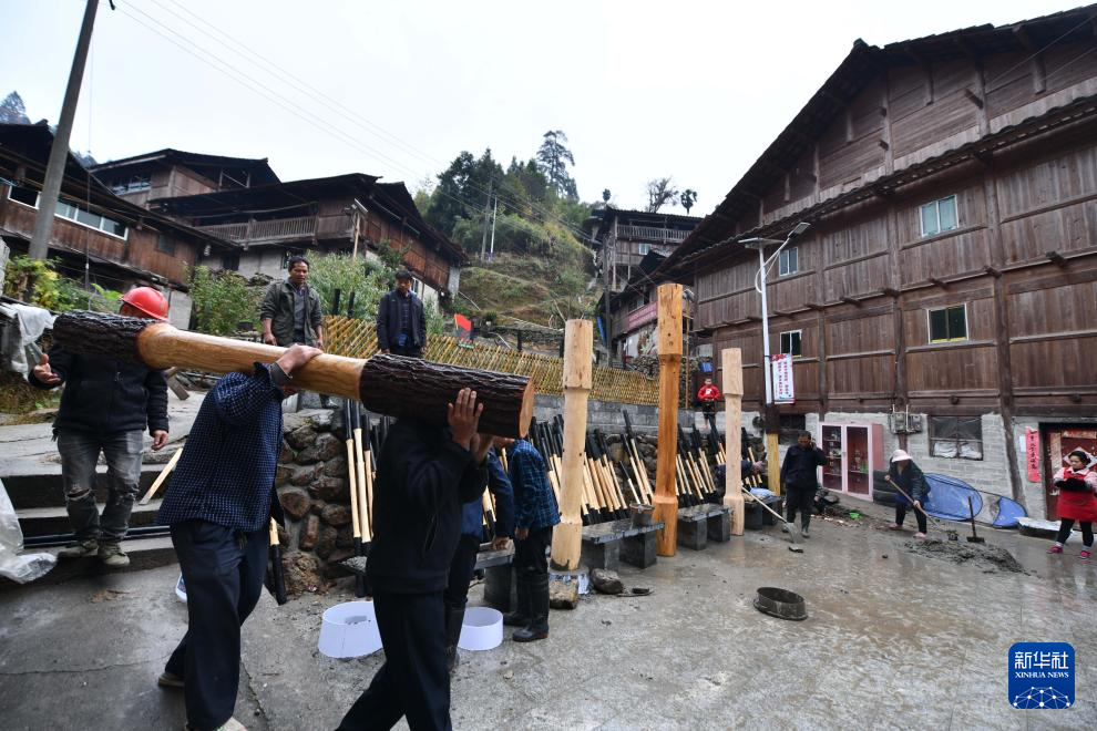乌英苗寨村民在为亮布文化小广场安装大型亮布槌(2022年11月19日摄)。